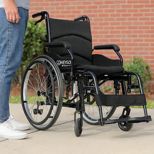 Standard wheelchairs are sturdy wheelchairs that have bigger wheels so the chair can be wheeled by the user and back handles if you want to push the chair from behind. Standard wheelchairs are not built to be light; they are built to be durable and great for long term use like in a hospital.
