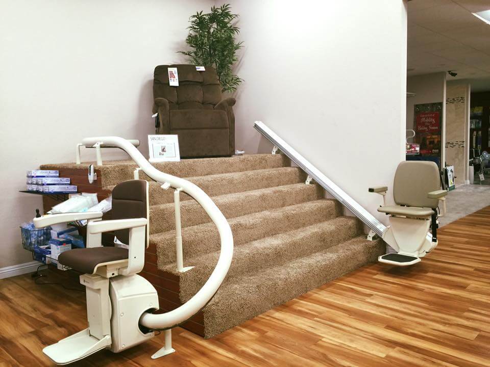 We have straight stairlifts, curved stairlifts and different ramps installed and ready to view in our store in Kearny Mesa San Diego. Come visit us to try them out and see what it would look like in your home!