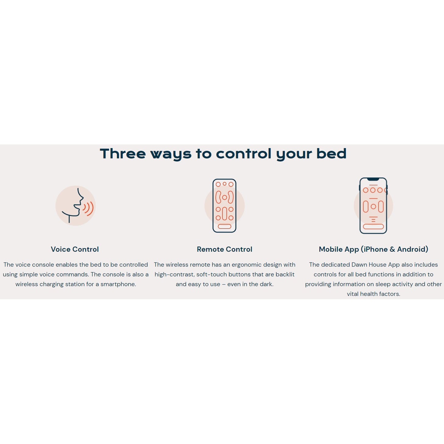 - Health sensors - Passively monitor sleep cycles, vital health indicators and connects to the Dawn House bed mobile app