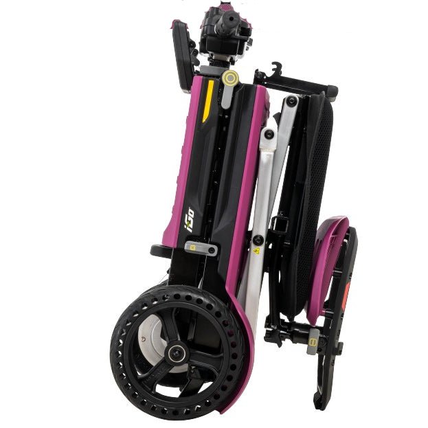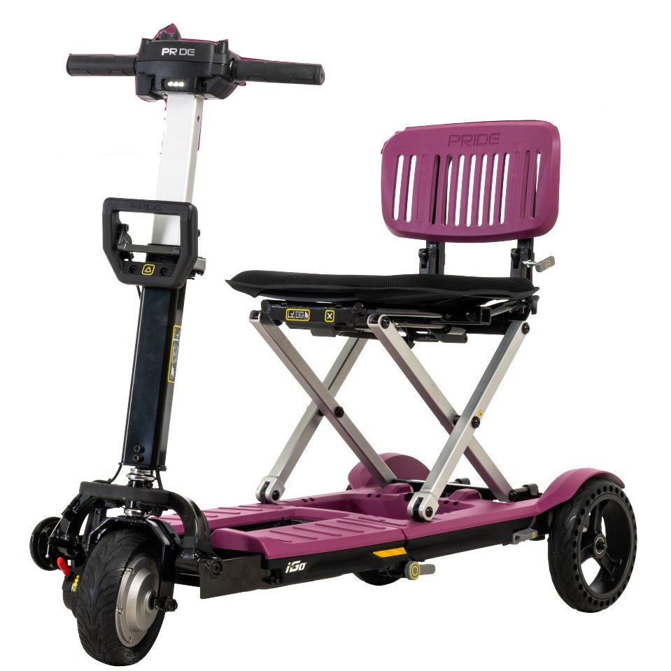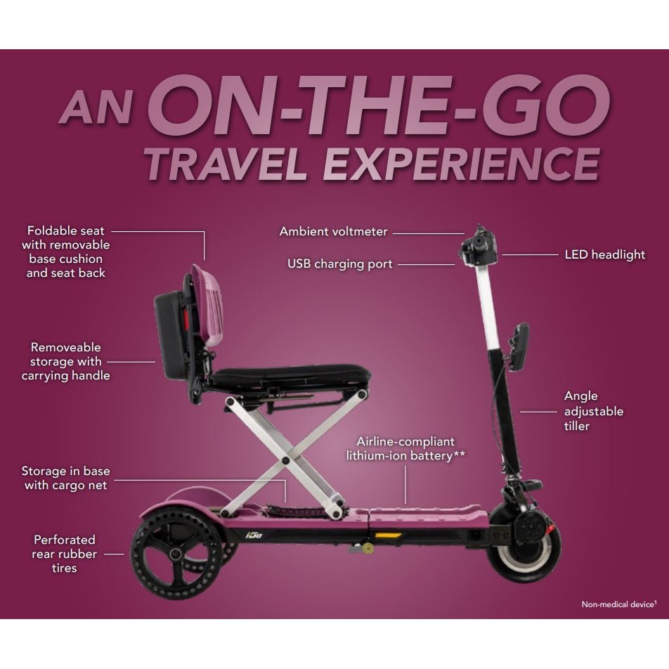 The i-Go™ Folding Scooter is the latest super portable mobility device by Pride Mobility and will open your world to new experiences. It folds down for easy stowing, disassembles into two pieces that weigh just 32 pounds each and is one of the most portable, travel-friendly devices that provides all-day power and mobility.